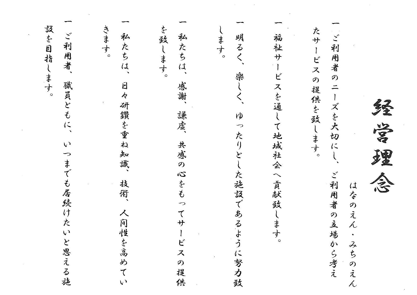 時代の変遷にともない、福祉ニーズの変化を敏感に把握し、社会の人々のために、良質な福祉サービスを提供する。いつでも、どこでも、だれでもが必要なときに、最善の福祉サービスを提供できるように、日々、研究・努力する。