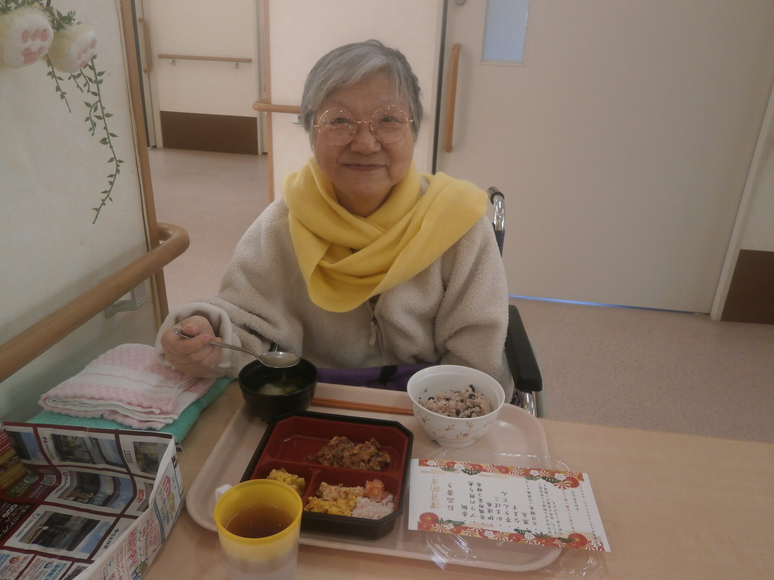 はなのえんでは、元日の昼食におせち御膳をご用意しました😊 赤飯に、ブリの照り煮、若鶏野菜3種巻、伊達巻、かまぼこ、なます、黒豆、 そしてお餅風ムースの入ったお雑煮風の一品まで、少しずつ色々なおかずを楽しんでいただける献立 […]